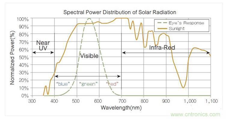 圖1 太陽光的光譜功率分布,其中的強(qiáng)功率紅外線成分對人眼而言是不可見的。