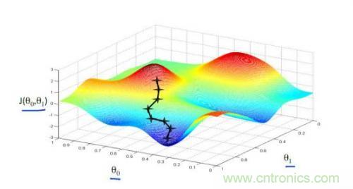 以上我們是以一維數(shù)據(jù)來看梯度下降,但我們的照片是多維數(shù)據(jù),此時如何求導數(shù)?又如何梯度下降呢?此時我們需要用到偏導數(shù)的概念。其實它與導數(shù)很相似,因為x是多維向量,那么我們假定計算Xi的導數(shù)時,x上的其他數(shù)值不變,這就是Xi的偏導數(shù)。此時應(yīng)用梯度下降法就如下圖所示,θ是二維的,我們分別求θ0和θ1的導數(shù),就可以同時從θ0和θ1兩個方向移動相應(yīng)的步長,尋找最低點,如下圖所示: