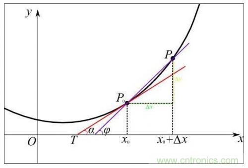 從幾何意義上看,變化率就變成了斜率,這更容易理解怎樣求函數(shù)的最小值。例如下圖中有函數(shù)y=f(x)用粗體黑線表示,其在P0點的變化率就是切線紅線的斜率: