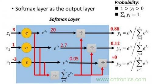 這樣給定x后可以得到x在各個類別下的概率。假定三個類別的得分值分別為3、1、-3,則按照上面的公式運算后可得概率分別為[0.88、0.12、0],計算過程如下圖所示: