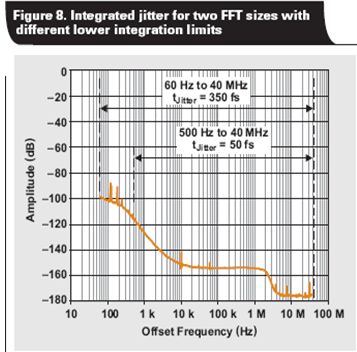 圖 6 所示相位噪聲圖抖動貢獻量為 ~360 fs,其頻率偏移為 10 到 100MHz 之間。這比 100Hz 到 10MHz 之間偏移的所有 ~194 fs 抖動貢獻值要大得多。因此,所選整合上限可極大地影響計算得到的時鐘抖動,以及預計SNR匹配實際測量的好壞程度。